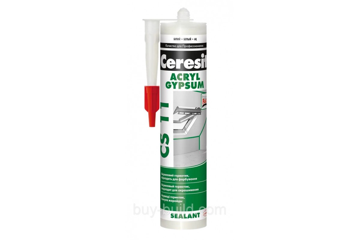 Ceresit CS 11 ACRYL GYPSUM — акриловий герметик, призначений для герметизація швів і стиків віконних та дверних блоків; заповнення тріщин у штукатурці та цегляній кладці всередині та зовні будівель. Має високу адгезію до цегляних, бетонних і штукатурних основ, деревини та анодованого алюмінію. Не застосовується для швів, що піддаються постійному впливу води (у басейнах, резервуарах). ВЛАСТИВОСТІ