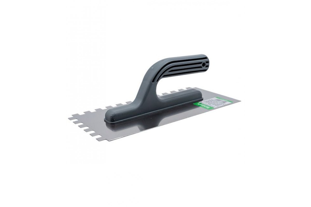 Гладилка нержавіюча Yoshimoto, з пластмасовою ручкою. Використовується для нанесення клейових розчинів при укладанні плитки, газобетонних блоків, утепленню фасадів.