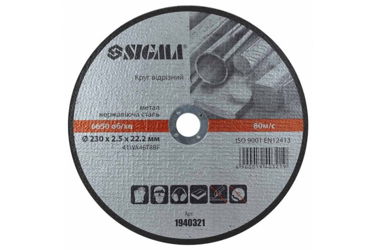 Круг отрезной по металлу и нержавеющей стали Ø230×2.5×22.2мм, 6650об/мин SIGMA (1940321) предназначен для резки изделий из металлов и нержавеющей стали, работы с кузовной сталью и другими аналогичными материалами.