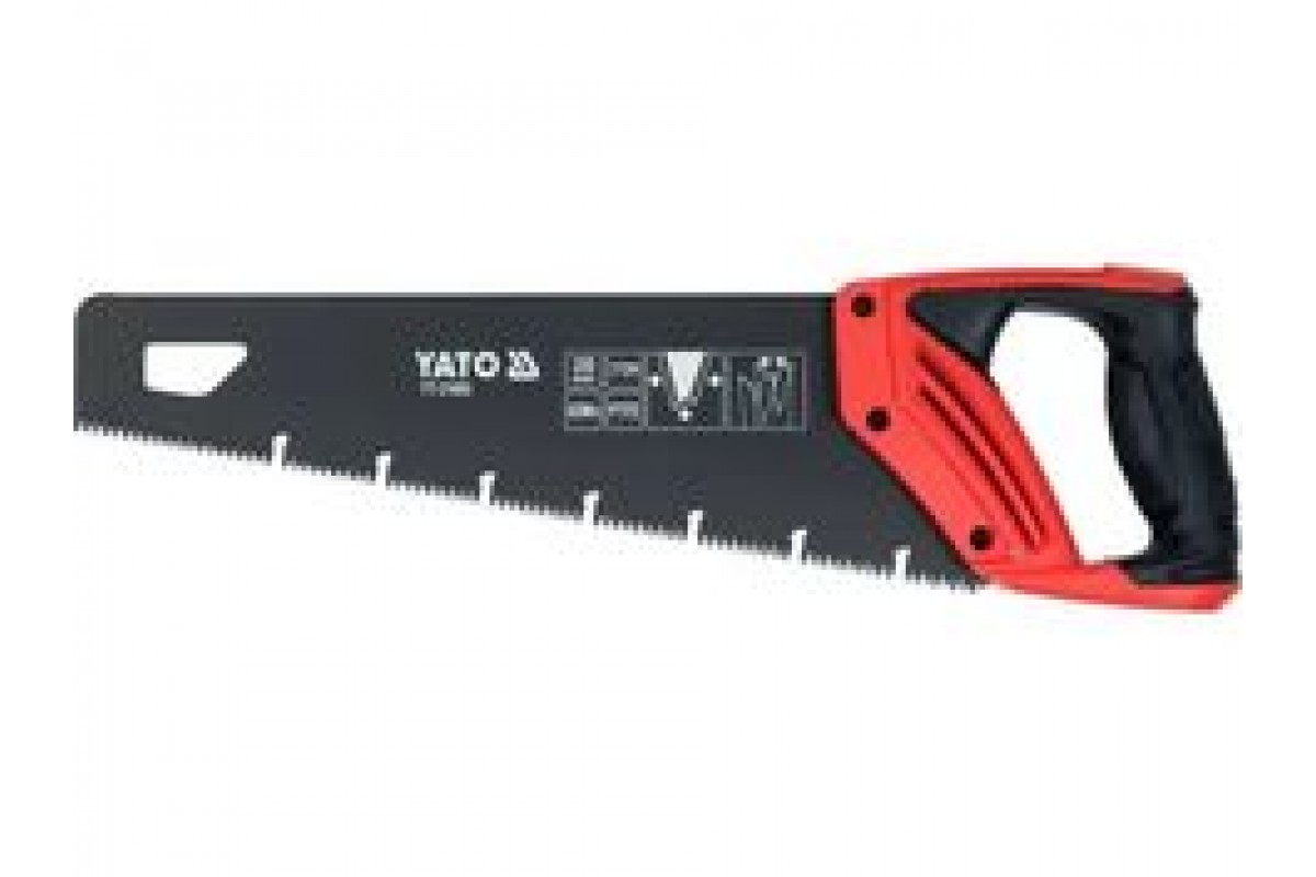 Відкидна пилка з тристоронніми зубцями YATO YT-31097, розташованими групами по 9 на дюйм. Зазори в лезі полегшують видалення тирси. Чорне тефлонове покриття PTFE зменшує тертя. Закрита ручка з гумовими елементами дозволяє надійно утримувати пилку.