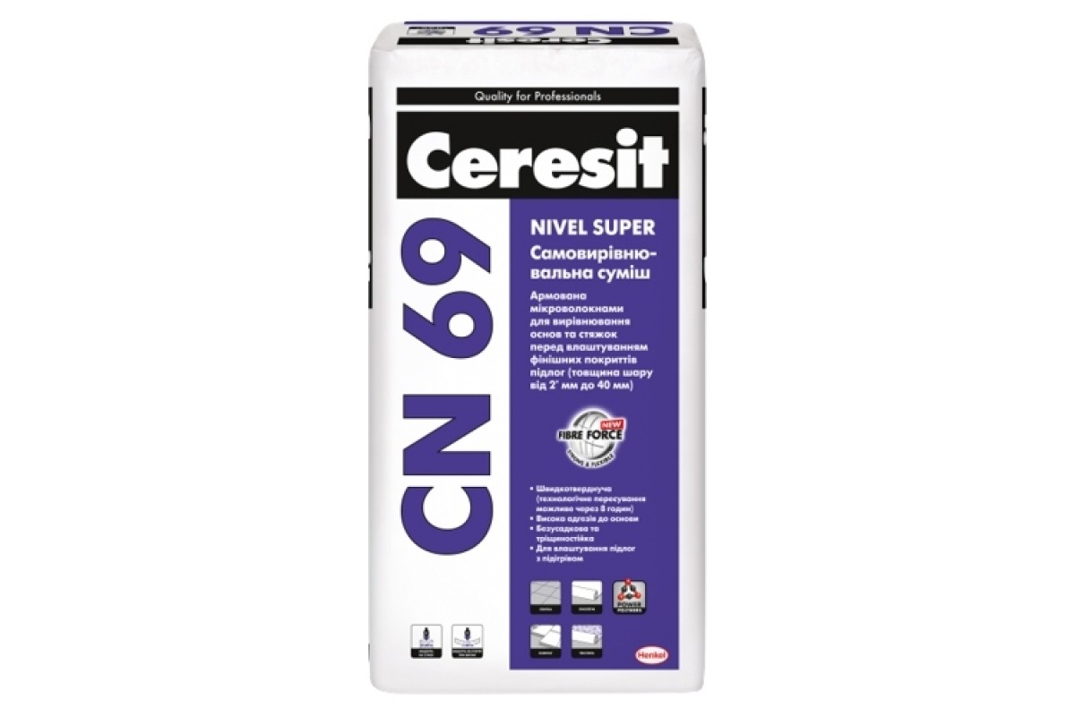 Самовирівнювальна суміш Ceresit CN 69 призначена для вирівнювання бетонних основ і цементно-піщаних стяжок, а також стяжок з легкого бетону перед укладанням фінішних покриттів (лінолеум, килимові покриття, ламінат, керамічна плитка, плитка ПВХ та інше). приміщеннях із невисоким рівнем вологості. Самовирівнювальна суміш Ceresit CN 69 використовується для влаштування підлог з підігрівом.- висока адгезія до основи
