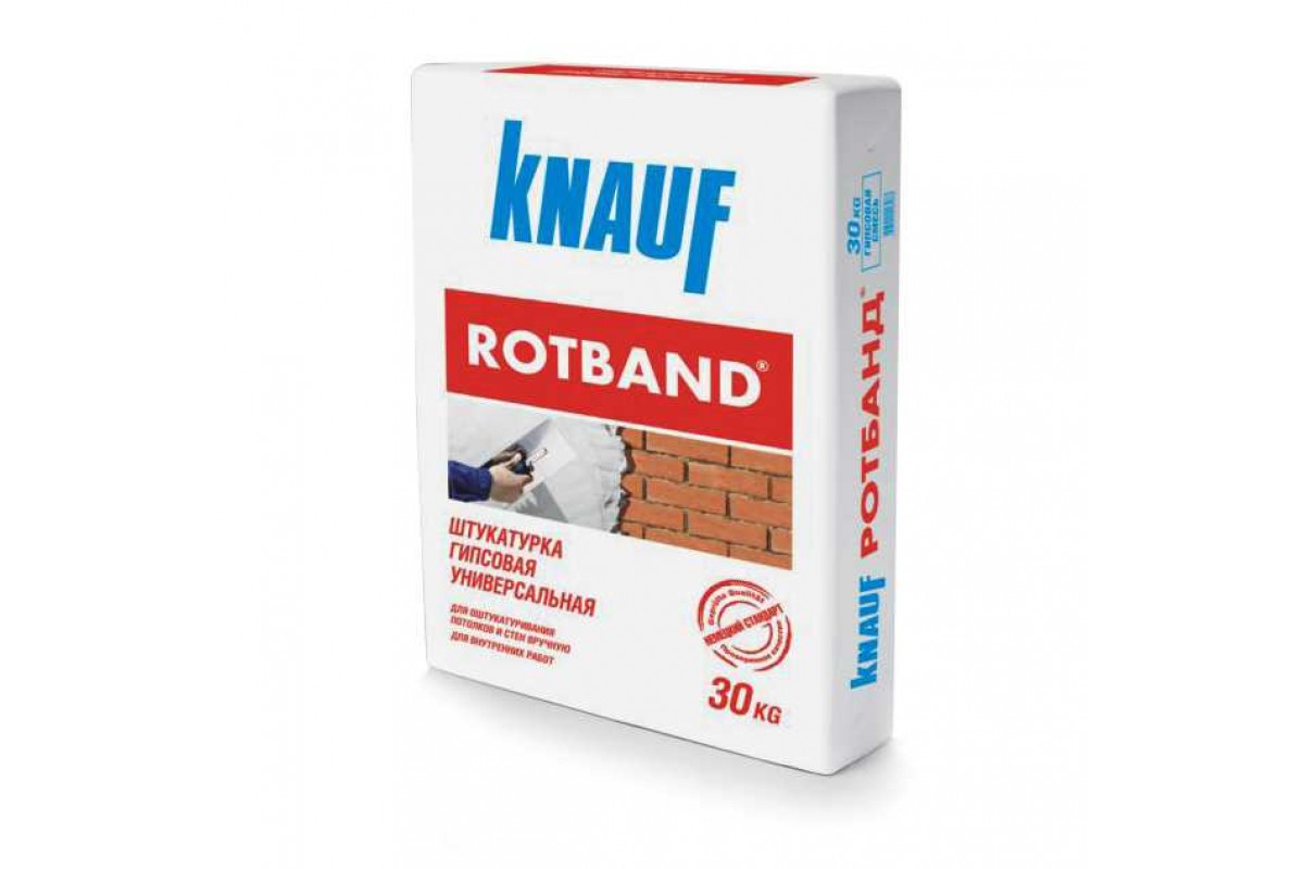Штукатурка гіпсова Кнауф (Knauf) Ротбанд застосовується для вирівнювання та шпаклювання поверхні перед фарбуванням, а також для створення декоративного шару. Призначена для ручного та механізованого нанесення. Основою штукатурки є гіпс вищої категорії, який розбавлений сумішшю мінеральних наповнювачів, що відіграє роль сполучної речовини. Rotband застосовується для високоякісного оштукатурювання вручну стін та стель усередині приміщень. Як штукатурна основа для фарбування, обклеювання шпалерами, облицювання плиткою або обробка декоративними штукатурками.
