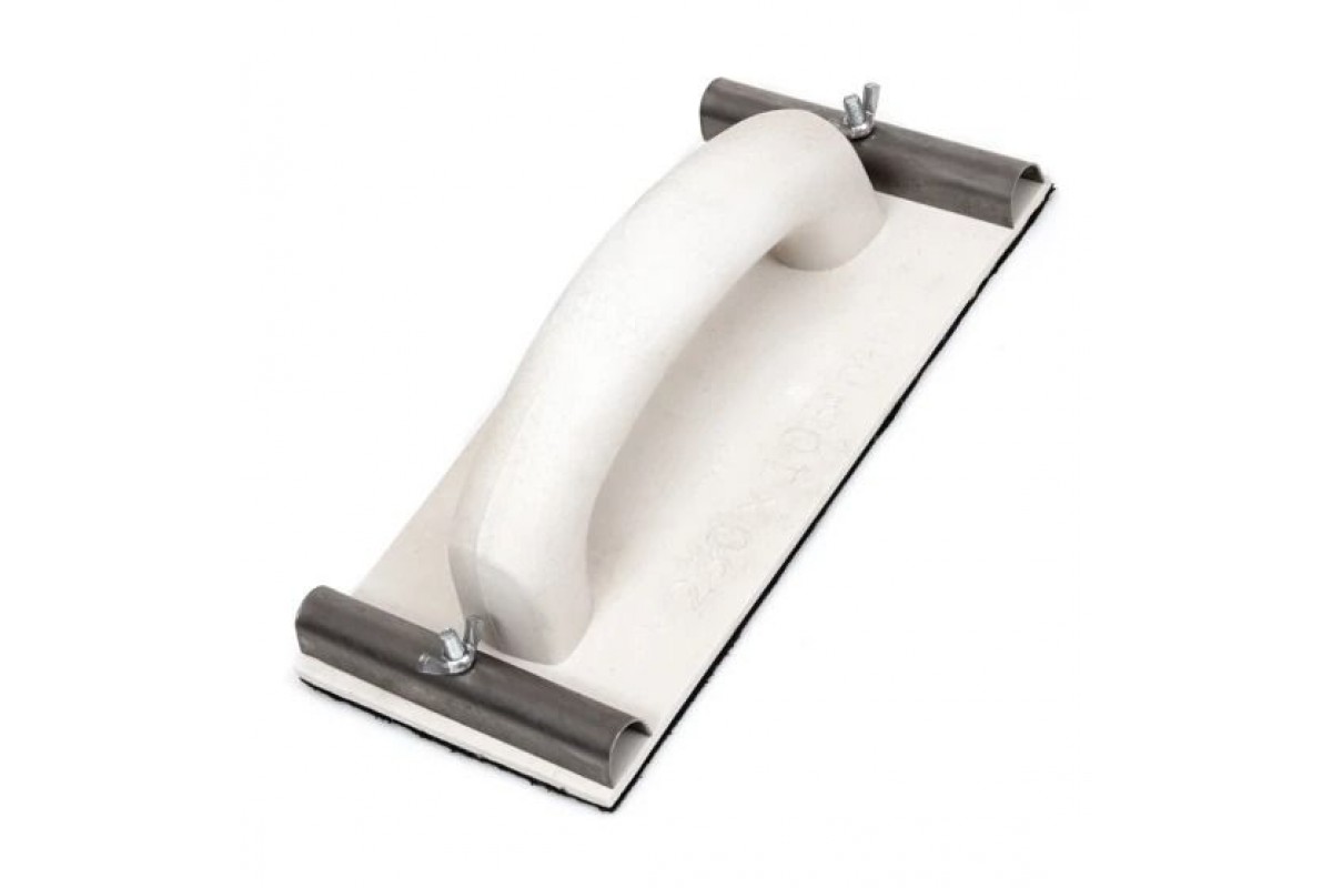 Терка для абразивної сітки та наждакового паперу є шліфувальним оздоблювальним інструментом, виготовленим з легкого, твердого, стійкого до деформацій пластику та оснащений гумовою робочою поверхнею. Основа виробу має два фіксатори-затискачі з засувками, що закріплюють абразивну сітку або папір на гумовій поверхні. Терка призначена для затирання та шліфування верхнього шару нанесеної на вертикальні та горизонтальні поверхні штукатурки, шпаклівки; під фарбування, поклейку стінових матеріалів та інше фінішне оздоблення. Рельєф металевої частини виробу має перфоровану структуру, тому не забивається пилом і частинками матеріалу, що обробляється, а значить, робота з ним не потребує перерв на очищення. Терка для абразивної сітки є легкою та зносостійкою, швидко відчищається від забруднень і може експлуатуватися як при малих, так і великих обсягах робіт. Терка Polax 100х220 мм (100-105
